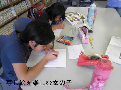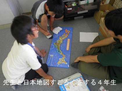 水曜日の放課後まなび教室は,部活動と重なっているため,参加児童は少なめです。でも,熱心な地域の先生と一緒にてきぱきと宿題を済ませます。そして,残りの時間はお楽しみです。男の子は「日本地図すごろく」を,女の子は図書室の本を利用して「写し絵」を楽しんでいました。