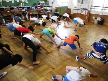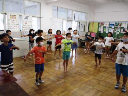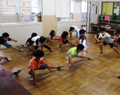 ソーランの動きを確認しています。しっかりと腰を落として,かっこよくなってきました。