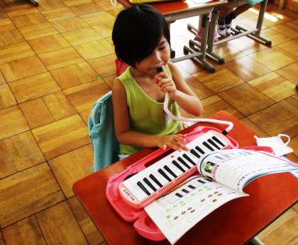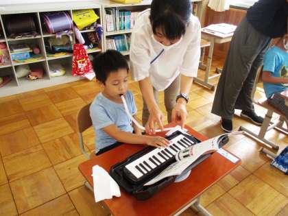 鍵盤ハーモニカで『どんぐりさんのおうち』などを演奏しています。指づかいにも気をつけて吹くことができるようになりました。
