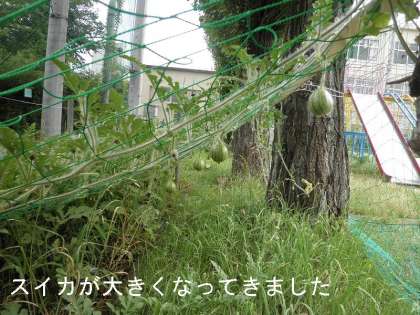 これから大事に育てていきたいと思いますが,学校ではだれもスイカを育てた経験がないので,(昨年は実がなる前に枯れてしまいました)「スイカの育て方」の本を読んで勉強しなければと思っています。