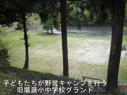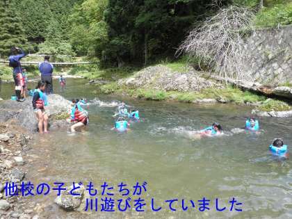 野営キャンプをする「旧堰源(えんげん)小中学校」を中心に,活動場所を念入りに下見しました。左京区の小学校がちょうど川遊びをしていました。