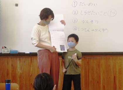 夏休みにがんばって仕上げた自由研究の発表をしています。発表を聞いて,質問をしたり感想を話したりしました。「え、そうなんや!」「たしかに。」「すごいね。」と素敵な反応がいっぱい。じょうずに話をしたり,聞いたりできるようになってきました。