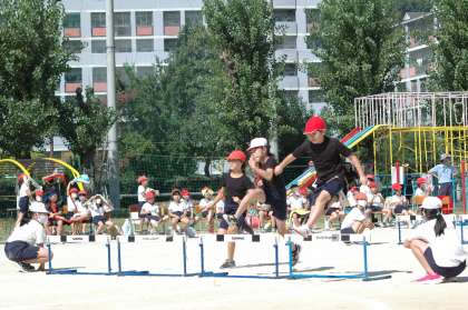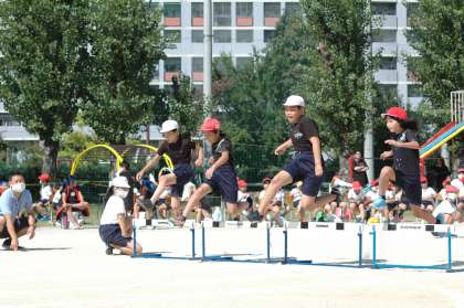 4年生は体育科で初めて「ハードル走」を学習しました。リズムよく「またぎこす」ことをめあてにがんばりました。歩数が合わずにハードルを倒したり,こけたりすることもありましたが,一生けん命走りました。