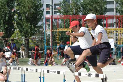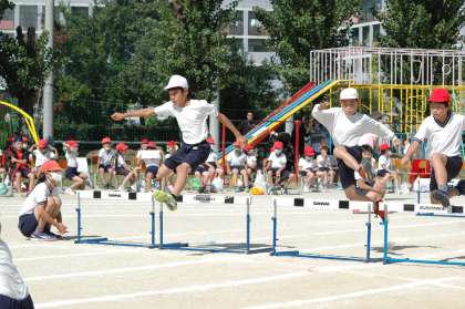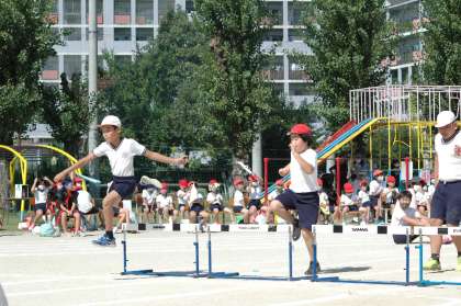 4年生の時に学習したことを思い出しながら,練習してきました。「1・2・3・トン」のリズムでスムーズにまたぎ越すことを意識して挑戦しました。頭の位置が変わらないようにすることもめあての一つでした。ゴールまでスピードを落とすことなく走りぬきました。