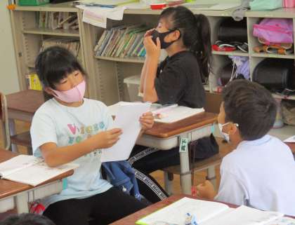 バスのダンスに見とれていた主人公の気持ちについて,ペアで話し合いました。