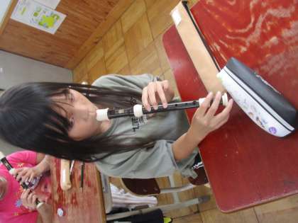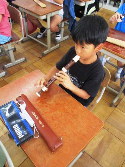 リコーダーの学習をしています。どのくらいの息の量ならきれいな音が鳴るかな?タンギングにも気をつけて『ソ』の音の練習をしました。