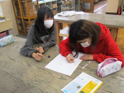 書道クラブはマーブリングした用紙に思い思いの字を書きました。