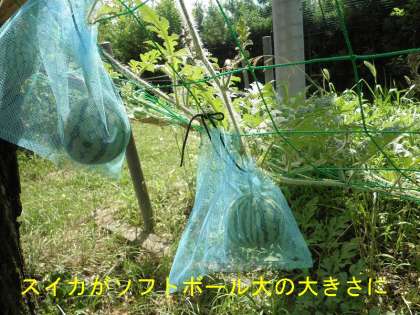 5年生の野菜畑のスイカが大きくなってきました。ソフトボール大の大きさに成長しています。数は,約10個!このまま順調に育ってくれることを願っています。