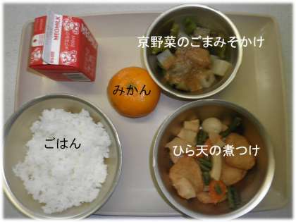 「京野菜のごまみそかけ」「ひら天の煮つけ」そして「冷凍みかん」がついていました。