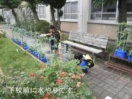下校時間に1年生の子どもたちは,自分たちで育てている「アサガオ」に水やりをしてから下校する習慣がついています。