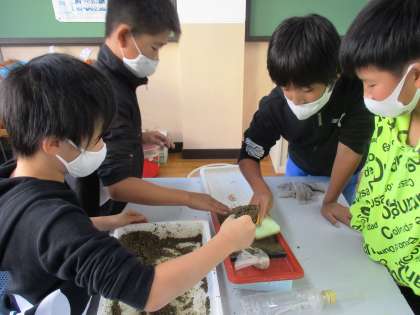 小さい川を作り,流れる水にはどんなはたらきがあるのかを実験して考えました。