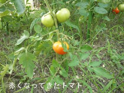 「トマト」ミニトマトは,どんどん収穫していますが,普通のトマトがようやく赤くなってきました。市販のトマトより少し小さいですが,すずなりに結実していますので,これからが楽しみです。