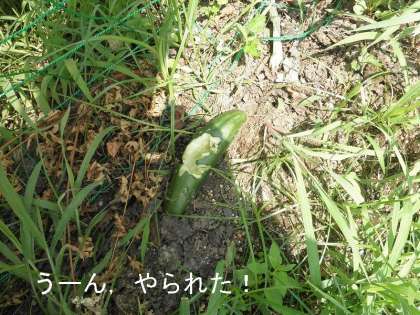 「キュウリ」新しく植えた苗は,一度しおれかけましたが,水やりのおかげで元気を取り戻してシャンと立っています。しかし,現在収穫中の5月はじめに植えたキュウリは,またまたカラスの被害にあいました。残念!