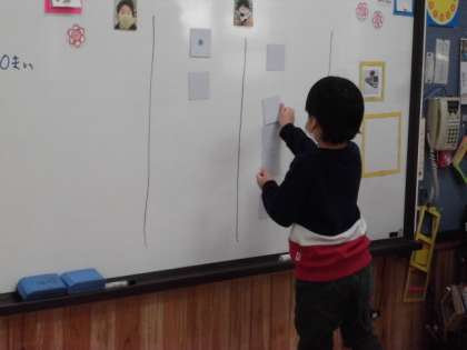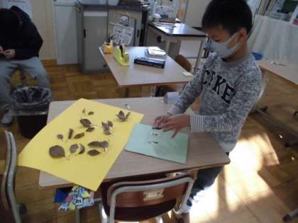 葉っぱの数を数えながら画用紙に貼ったり、似たようなカードを見つけてグループ分けをしたりしました。
