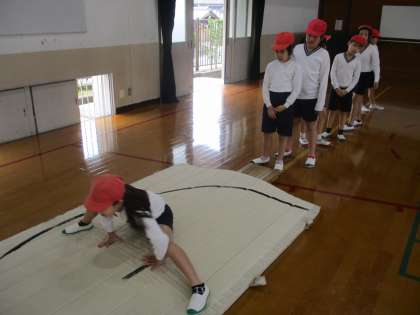 マット運動です。ねらい2では,がんばればできそうな技に挑戦しています。それぞれの場で,後転や開脚前転,側転の練習をしました。