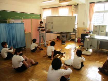 身体計測の前に,お話を聞きました。3くみは,普段1分間に20回〜30回のまばたきをしていますが,ゲームやスマホなどの画面を凝視していると,4分の1程度に激減します。まばたきは、目の外部から守ったり、涙を目に運んで乾燥を防いだりする重要な役割を担っています。まだたきの回数が減ると目の表面が涙で十分に保護されなくなり、目に傷つくこともあるので注意が必要です。