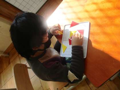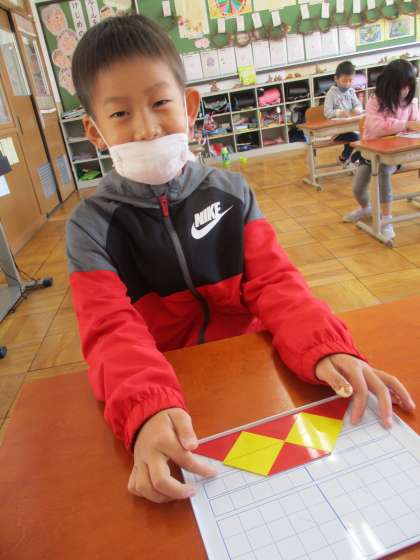 たし算の復習をした後,色板を使って,かたちづくりの学習をしました。