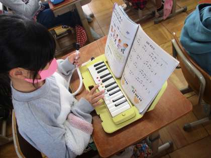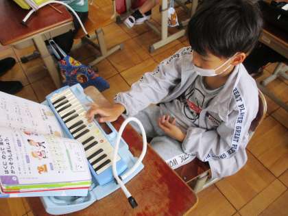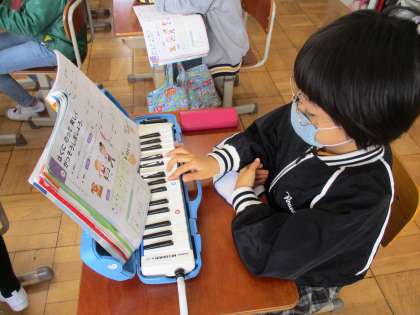 階名で歌ったり,鍵盤ハーモニカで『山のポルカ』を演奏したりしています。