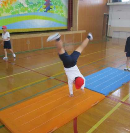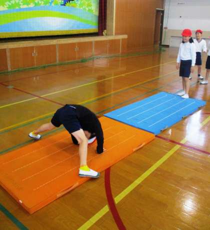 マット運動で,組合せ技の連続に挑戦しました。テストでは,緊張しながらがんばりました。