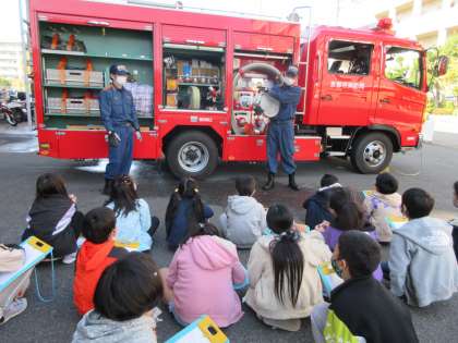 消防士さんのお話では,ポンプ車の中を見せていただき,ホースの長さや太さについても教えていただきました。