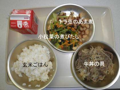 「玄米ごはん」におかずは,「牛丼の具」「小松菜の煮びたし」「トラ豆の甘煮」でした。