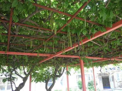 昨日,中庭の藤棚に涼みに行ってびっくり!藤棚の上を見上げると,「藤の実」がいっぱいぶらさがっていました。