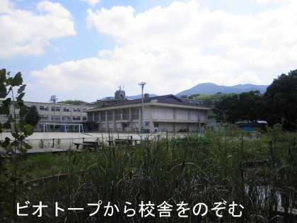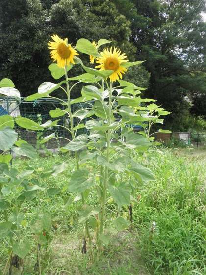 休日の学校では,学校園の向日葵(ひまわり)が太陽に向かって堂々と咲いています。緑のカーテンの沖縄アサガオ(ヘブンリーブルー)も真っ青のきれいな花を咲かせています。そして,ビオトープでは,ガマが池の中せましと群集して茶色の穂をつけています。