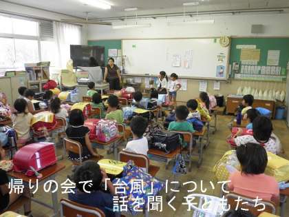 朝の会,そして帰りの会でも,先生から「台風」が来た時のお話しを聞きました。今夜,そして明日に台風が来て警報がでた場合,どうしたらいいのか?1年生の子どもたちは,真剣に聞いていました。