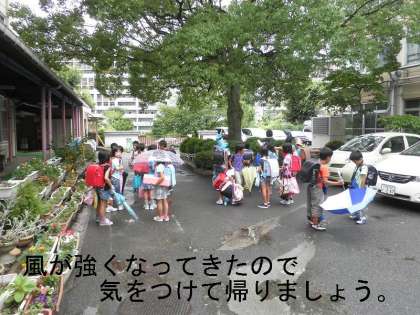2年生も正門前に集合し,みんなで一緒に下校しました。台風の影響で風が強くなってきていたので,カサのさし方に注意しながら下校しました。
