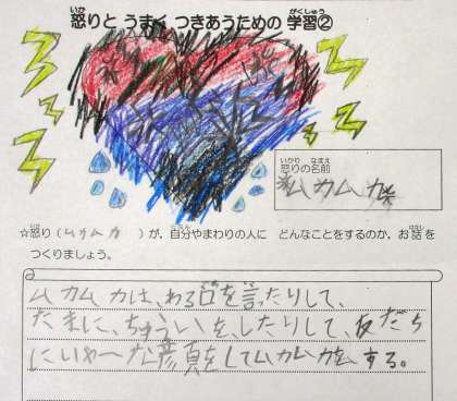イライラする気もちを色や形で表し,イライラするとどんな気もちになるのか,どのようになるのかを物語にして考えました。もしその怒りが出てきた時に,どのように対処ができるのか,少しずつイメージできるようになっていくといいなと思います。