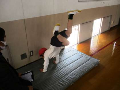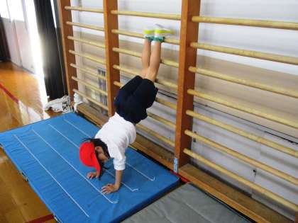 肋木を使って逆立ちの練習をしたり,後転の練習をしたりしています。