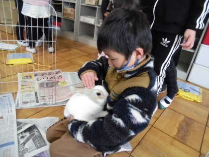 学校では『カフェ』と『ラテ』の2羽のうさぎを飼っています。1年生は今日初めて『カフェ』『ラテ』と触れ合いました。「うさぎってあたたかいね」「鼻がヒクヒクしているよ」「うさぎの毛はふわふわだなぁ」など触れ合いを通してたくさんのことを学ぶことができました。