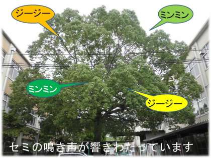 子どもたちより元気な?生き物が正門前のクスノ木にいます。早朝より,ミンミン,ジージーと鳴いています。