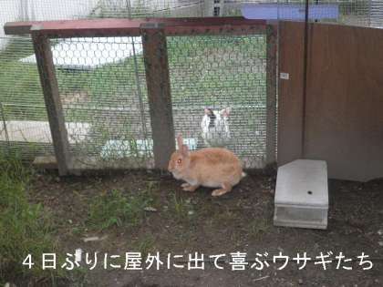 休日や台風のため,ウサギたちはずっと飼育小屋の中で過ごしていましたが,今朝,4日ぶりに外にだしてやりました。ストレスがたまっていたのか,扉を開けると,一目散に飛び出して行きました。草を食べたり土を掘ったり・・・。うれしそうです。