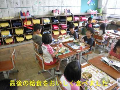 夏休み前の最後の給食になりました。1年生の教室をのぞいてみると,グループで仲良くおいしく食べていました。