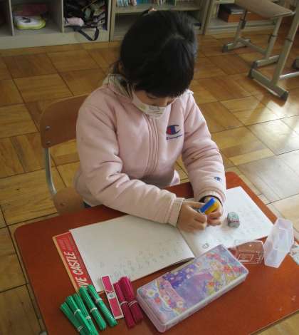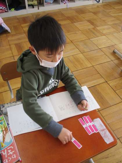数え棒を使って確認しながら,考えています。自信を持って答えられるようになってきました。