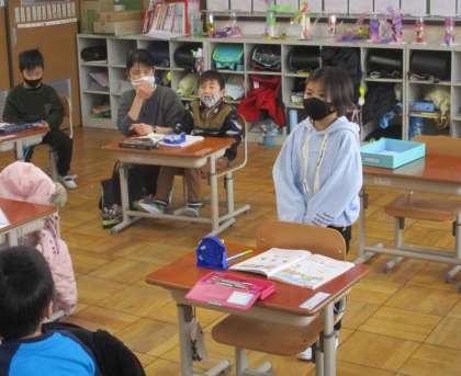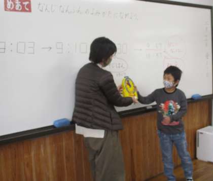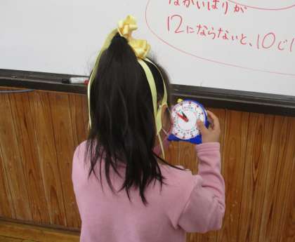 時計を実際に触りながら,時刻の学習をしています。10時57分は,長針と短針をどこにあわせればよいかな?話し合いながら学習しました。