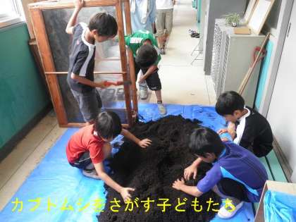学習会終了後,e-naプロジェクトで育てていたカブトムシケースを掘り返して,オス・メス1匹ずつ小分けにしました。