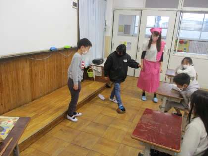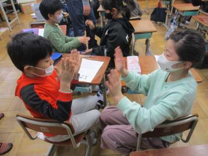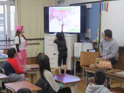 場所や文化,食べ物などについて教えていただき,みんな興味津々の様子でした。そのあとは,じゃんけんや手遊びをして楽しみました。