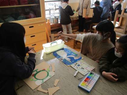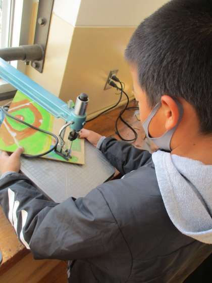 丁寧に絵の具で彩色した木の板を電動のこぎりで切っていきます。緊張しながら,安全に気を付けて作業を進めています。