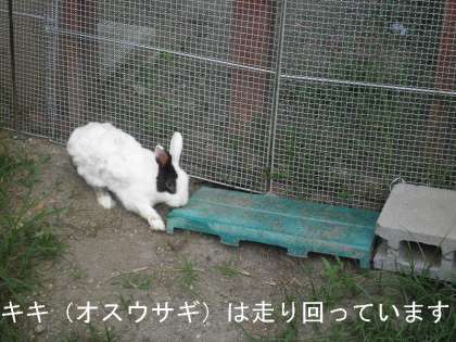 キキは小屋の中と屋外飼育場を行ったり来たりして走り回っています。野菜(ニンジン)をよく食べています。