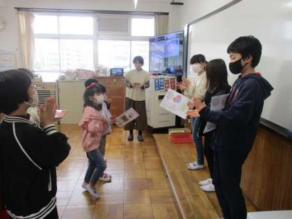 ゲームで楽しんだ後に,6年生への感謝の気持ちをひとりずつ伝え,グループでプレゼントを渡しました。最後に,6年生がいない間に1〜5年生で撮影した動画をみんなで見ました。6年生もとても嬉しそうな表情でした。みんなのあたたかい気持ちが6年生に伝わる会になりましたね。