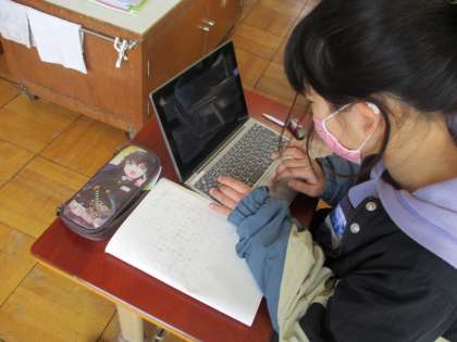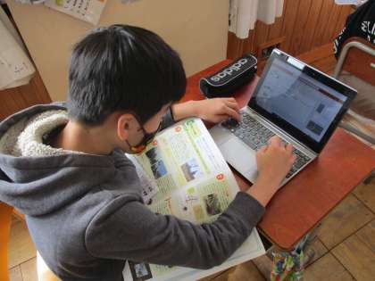 社会科で舞鶴について調べ学習をして作成したパワーポイントを仕上げて,マイクロソフト365のTeams上に提出しています。そうすることで,みんなが作成したパワーポイントをお互いに見合うことができます。タブレットパソコンを使っていろいろな学習の仕方を身につけています。