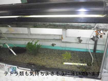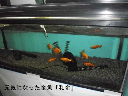 保健室前の水槽で飼っている大型肉食魚「オスカー」小型熱帯魚「テトラ」,そして職員室前の金魚「和金」がグロッキー気味?です。あまり動きません。