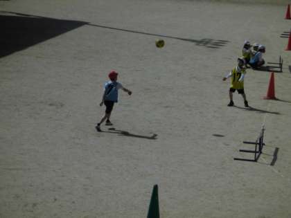 ボール蹴りゲームをしました。パスやゴールがだんだん上手になってきました。