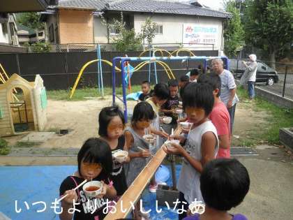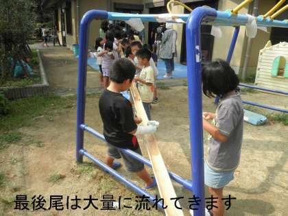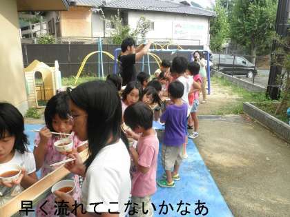 すると,子どもたちが楽しそうに庭に出て「流しそうめん」を食べています。時にはマスカット(ブドウ)も流れてきて取り合っています。まるいマスカットはなかなかつかめません。「流しマスカット」はおもしろいアイデアですね。