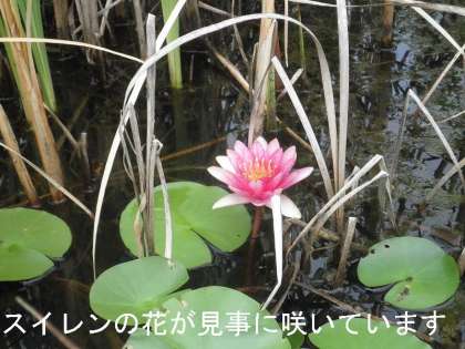 また,池の中にはスイレンの花が鮮やかに咲きはじめています。葉の上には「カエル」が,葉の下には「メダカ」が一休みしています。