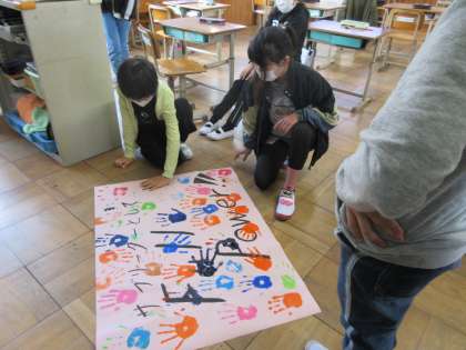 5年生は,学級目標を作成し,掲示する準備をしました。カラフルな手形で心を一つにします。また,今年度最初の音楽の学習もありました。