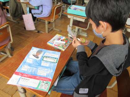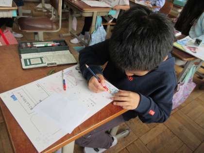 3年生は「自己紹介カード」を仕上げていました。がんばりたいことや好きなことなどを書いたカードに自分の写真を貼り付けました。