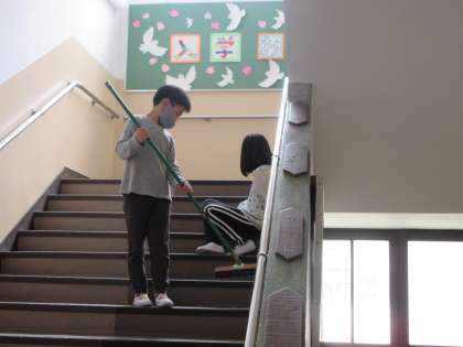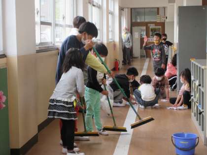 今日は給食もスタート,そして,そうじもスタートしました。新しいそうじ場所を一生懸命にきれいにしていました。1年生は6年生にそうじの仕方を教えてもらいました。